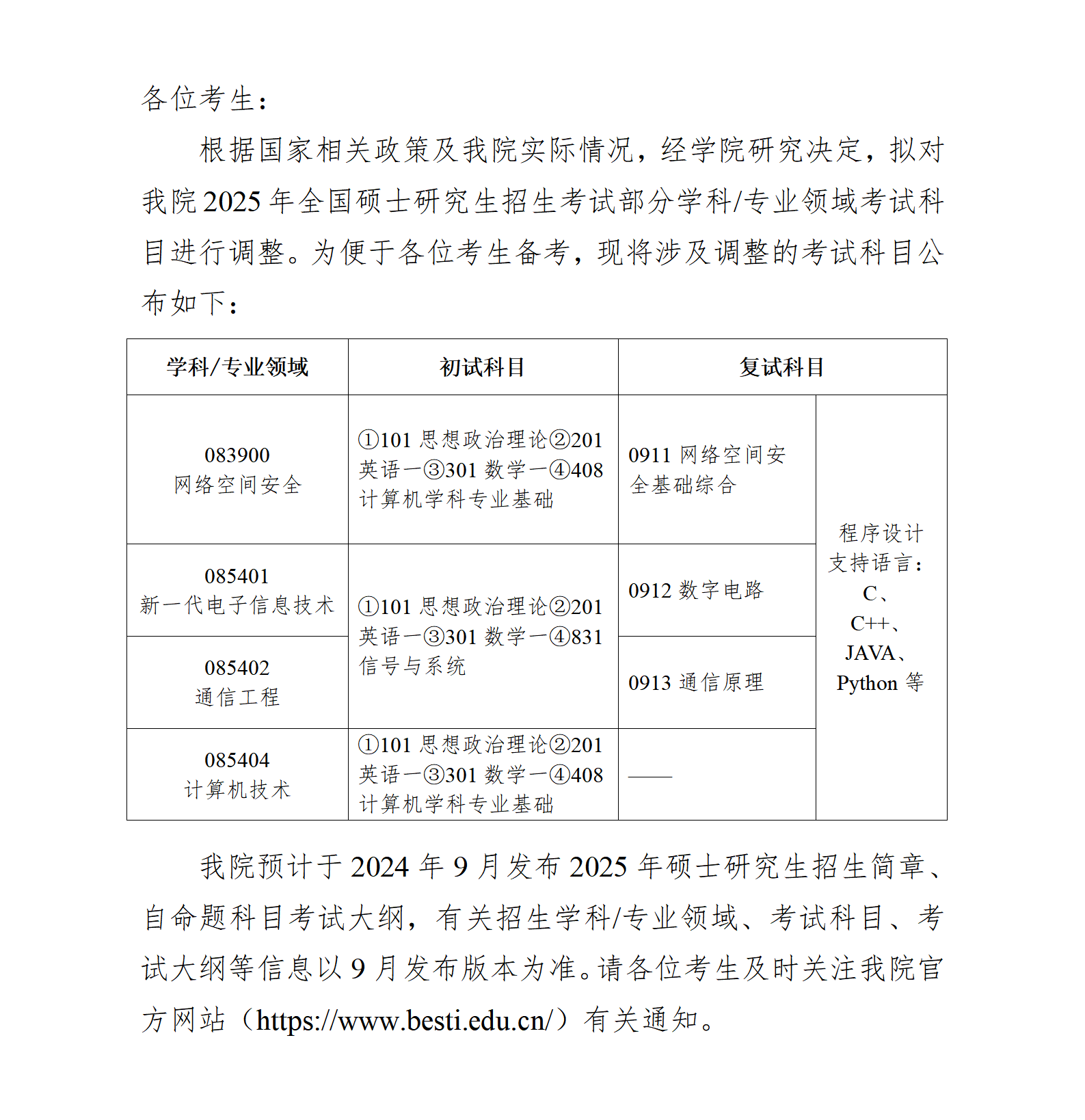 关于调整2025年硕士研究生招生考试科目的通知