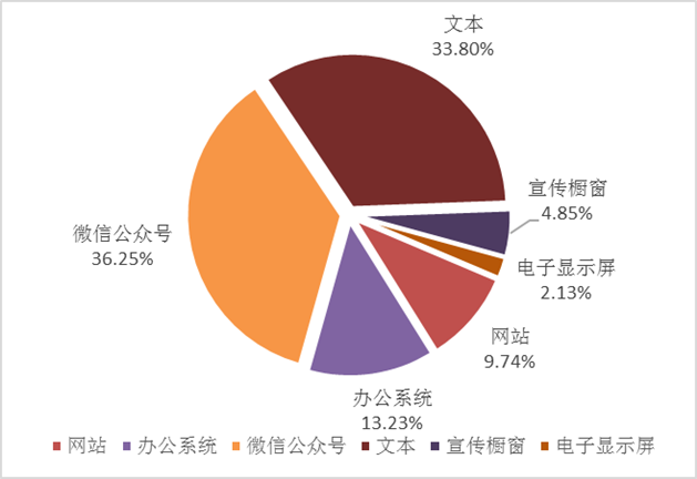 在主动公开的信息中,通过校园网及院外有关机构及部门网站(中直采购网、国家研招网等)方式进行公开的信息215条,占主动公开信息的比例为9.74%;通过院内办公系统方式公开的信息292条,占主动公开信息的比例为13.23%;通过文本方式公开的信息746条,占主动公开信息的比例为33.80%;通过宣传橱窗公开的信息107条,占主动公开信息的比例为4.85%;通过电子显示屏公开的信息47条,占主动公开信息的比例为2.13%;通过微信公众号公开的信息800条,占主动公开信息的比例为36.25%。