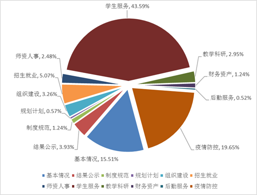 本学年度,学院主动公开信息约1934条。在主动公开的信息中,包括学院概况、学院领导、内部管理体制等基本情况类信息300条,占主动公开信息的比例为15.51%;会议纪要、干部任命、师生获奖奖项评定等结果公示类信息76条,占主动公开信息的比例为3.93%;各类办法、规定等制度规范类信息24条,占主动公开信息的比例为1.24%;学院年终总结、工作计划等规划计划类信息11条,占主动公开信息的比例为0.57%;党建方案、支部换届、党员发展等组织建设类信息63条,占主动公开信息的比例为3.26%;本研招生、学生就业类信息98条,占主动公开信息的比例为5.07%;团学活动、图书资源使用等学生服务类信息843条,占主动公开信息的比例为43.59%;师资队伍建设和人事任免类信息48条,占主动公开信息的比例为2.48%;各类教学活动安排,以及科研课题、评奖等教学科研类信息57条,占主动公开信息的比例为2.95%;财务预算、决算、收费标准,以及资产清查等各类财务资产类信息24条,占主动公开信息的比例为1.24%;基建维修、招标采购等后勤服务类信息10条,占主动公开信息的比例为0.52%;新冠肺炎疫情防控数据等疫情防控类信息380条,占主动公开信息的比例为19.65%。本年度,学院召开党委会20次、党委常委会34次、院长办公会22次、学院疫情防控工作领导小组会8次,公开了大量学院的相关信息。