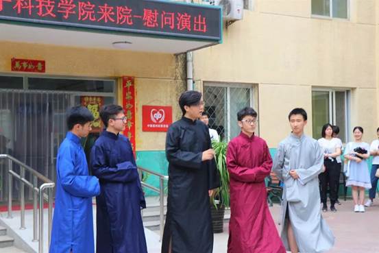 相声,我国民间说唱曲艺。我们电通学子为了本次敬老院活动也穿上长衫,运用说、学、逗、唱的形式,向老人们表演了《祝您健康》,相声诙谐幽默,将饮食健康作为主题融入到相声中,向老人们介绍各个食物的好处和坏处。