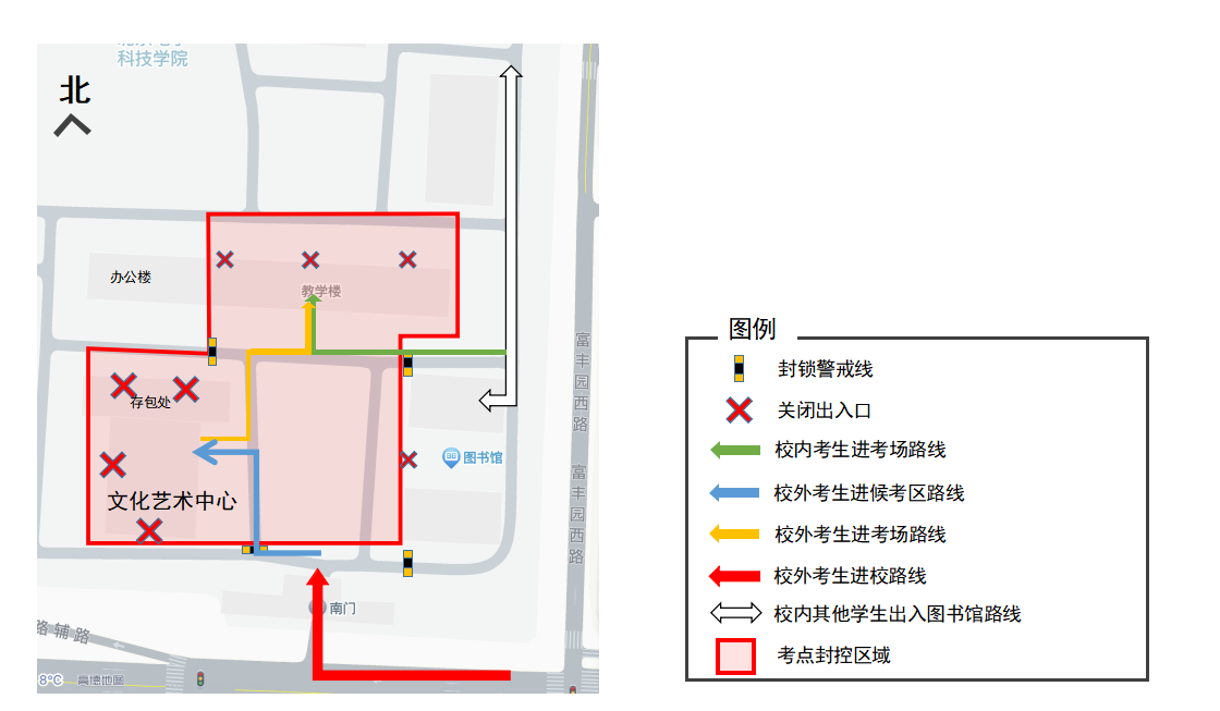 校外考生从学院南门进出,考试当天7:0012:00开始允许考生本人进入。南门设置两条核验通道,由工作人员验证考生准考证和身份证无误后进入校园。校内考生从学院图书馆北侧通道进入考场楼入口,工作人员核验准考证和身份证无误后方可通行。