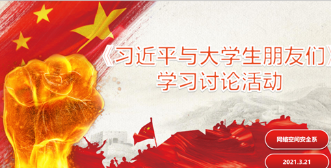 为加强新时代大学生政治理论学习,强化我系团学骨干队伍建设,培养积极求知的学习态度,我系于2021年3月19日下午,在主教学楼412召开网络空间安全系《习近平与大学生朋友们》学习讨论活动。