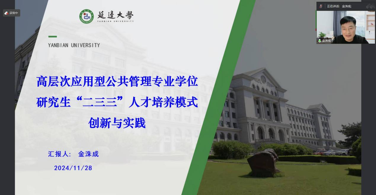 11月28日晚,经MPA教育中心邀请,延边大学MPA教育中心主任金洙成老师通过线上方式为我院MPA师生举办讲座。本次讲座以“高层次应用型公共管理专业学位研究生‘二三三’人才培养模式创新与实践”为主题,着重围绕案例大赛的孵化、指导和转化工作展开,MPA专任教师、MPA研究生共计三十余人参加讲座。