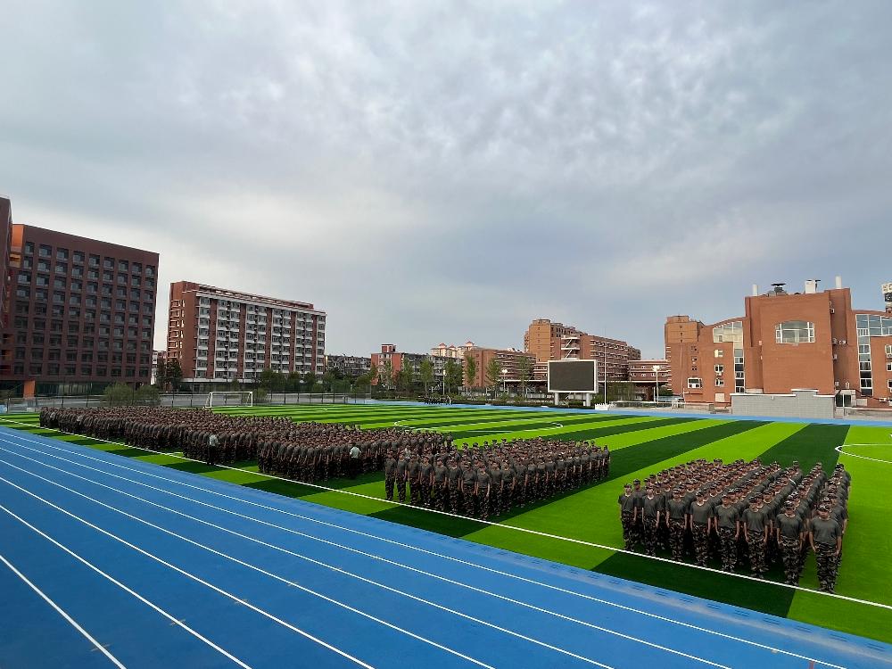 7月1日,电科院2021、2022级学生军训开营式在田径场举行。副院长肖嵩、承训单位负责同志、各系党总支书记、学生辅导员、受训学生班班主任、2021、2022级本科生和全体教官共约900人参加开营式。本次军训为期14天,训练内容主要包括分队队列动作、共同条令教育、基础战术和军体拳等。