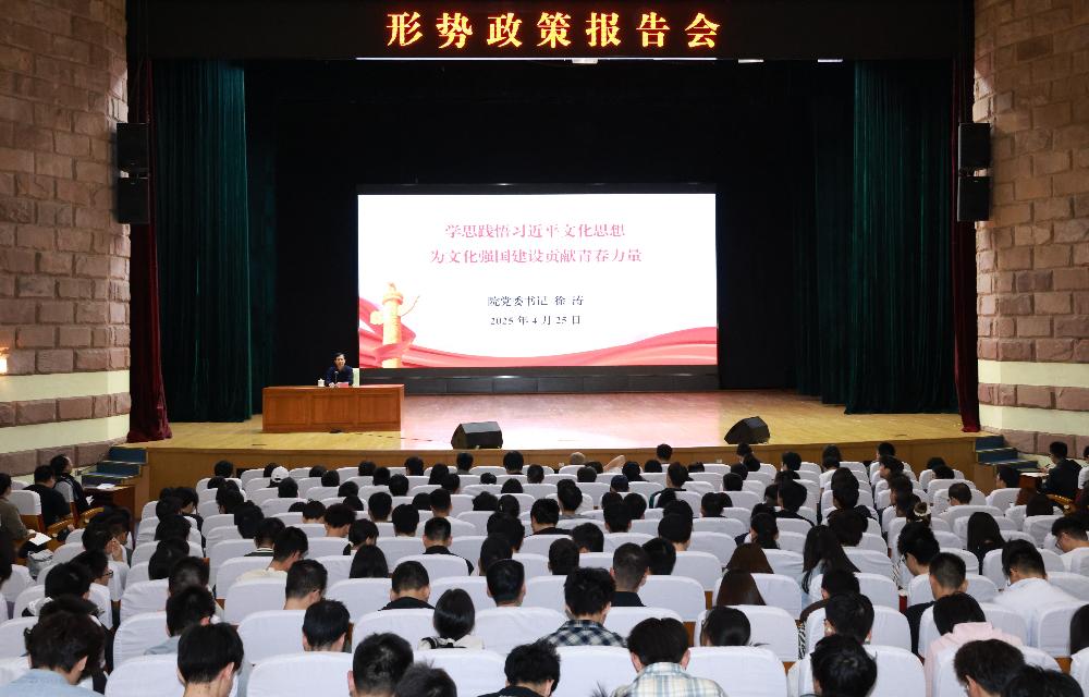 4月25日下午,院党委书记徐涛以“学思践悟习近平文化思想 为文化强国建设贡献青春力量”为题为全院2000余名学生作形势政策报告。报告围绕“什么是习近平文化思想”、“为什么要建设文化强国”、“为什么要坚持党的文化领导权”、“为什么要牢牢掌握舆论主导权”、“为什么说‘两个结合’是我们取得成功的最大法宝”、“物质富有了,精神就会富有吗”、“为什么要培育和践行社会主义核心价值观”等7个问题作辅导,并结合学院人才培养实际和学生成长需要,向学生提出担当青年文化使命的殷切期望,帮助学生深刻领悟习近平文化思想、自觉增强文化自信。